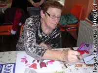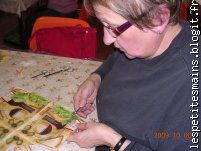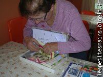 Tandis que les ciseaux découpent. Comme toujours, Monique s'est lancée dans un découpage super difficile, Annie n'a pas retrouvé ses papillons, Evelyne s'applique ... et réussit son découpage et même le collage de sa serviette.