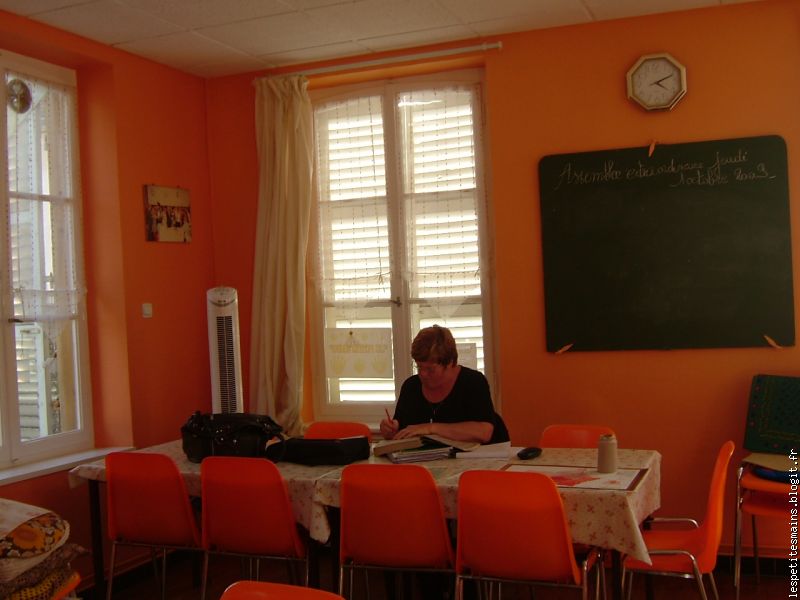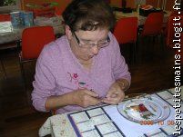 Marguerite "crâne" (à juste titre) avec son super bracelet, bien qu'elle ait pesté pour enfiler ses perles. Le nez est sur les tables : Renée, Nicole, Maryse, entourées d'Agnès, qui n'hésite pas à faire recommencer ....