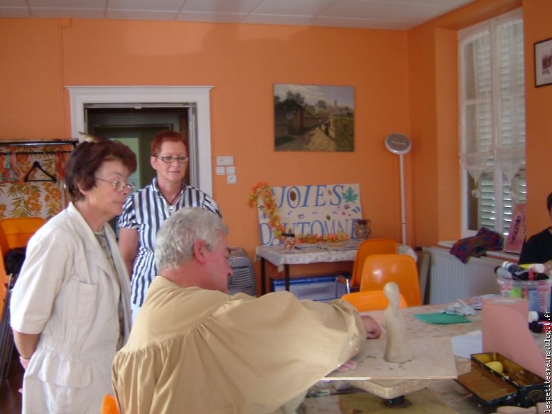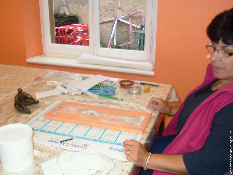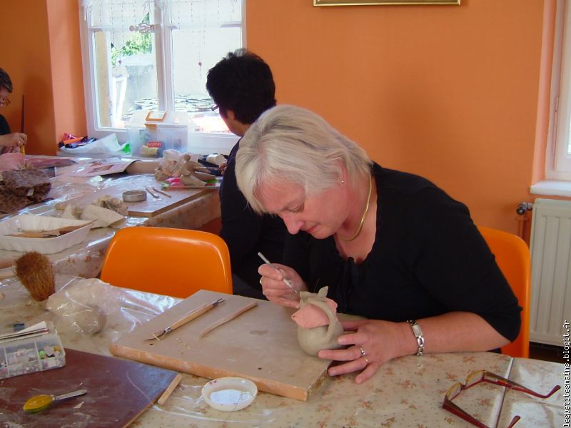 Allez, on recommence à triturer la terre et déjà de nouvelles réalisations : une crêche prend forme, Evelyne et Michèle, nos deux débutantes ont bien sûr réalisé un chat. Pas facile de faire une boule ronde, de la vider, la remodeler ... et ce nez ! mais au final un petit minou est né !!