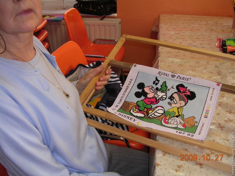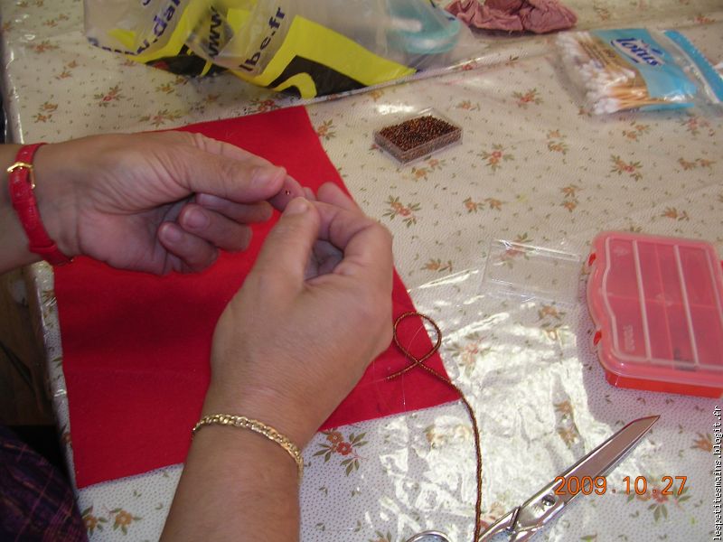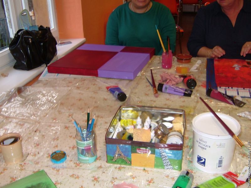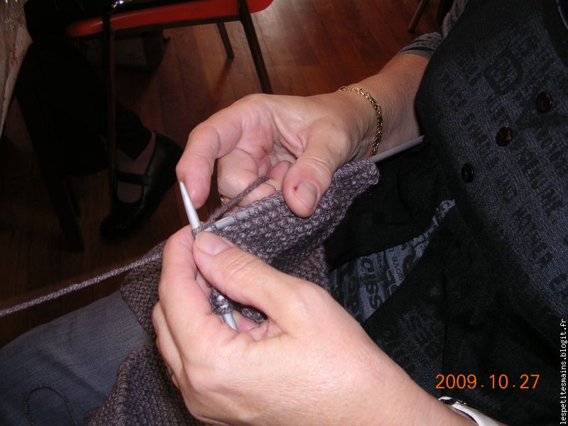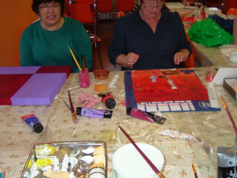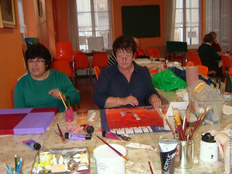 Encore des perles (Nicole, le nez sur son bracelet), du tricot (allez Evelyne, un point mousse après l'autre, tu arriveras au bout !!), du canevas pour Marie-France, du collage serviettes (Annie, ils sont beaux vos anges) - Monique, des chats ... et Jeannette (hé oui) qui se fatiguent les yeux à couper des morceaux de papier or et argent pour confectionner des boules de Noël !!