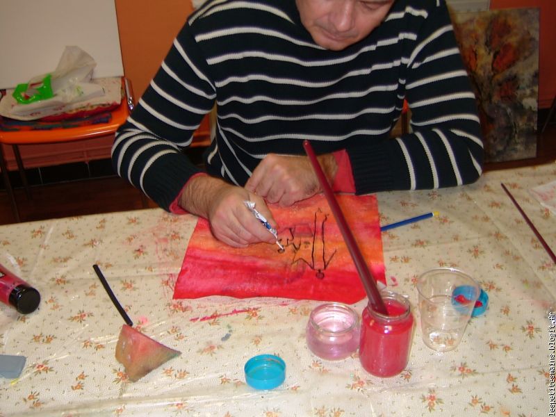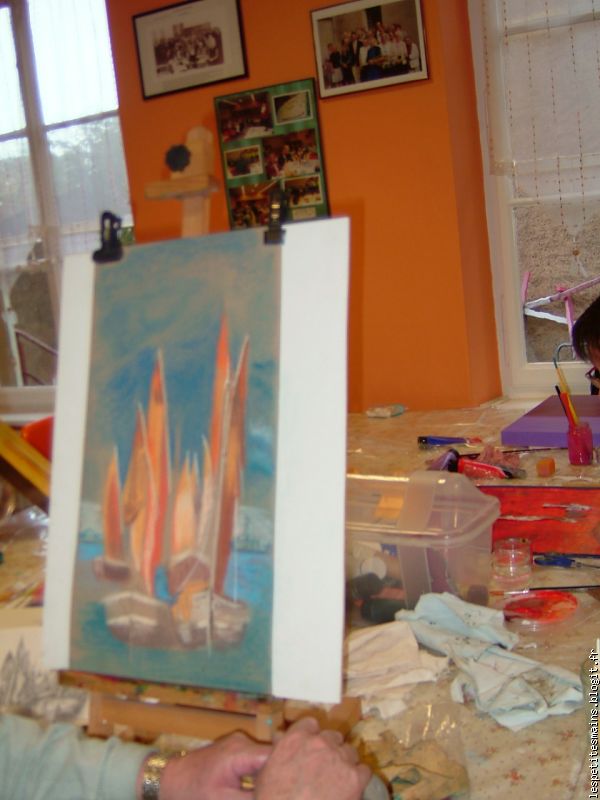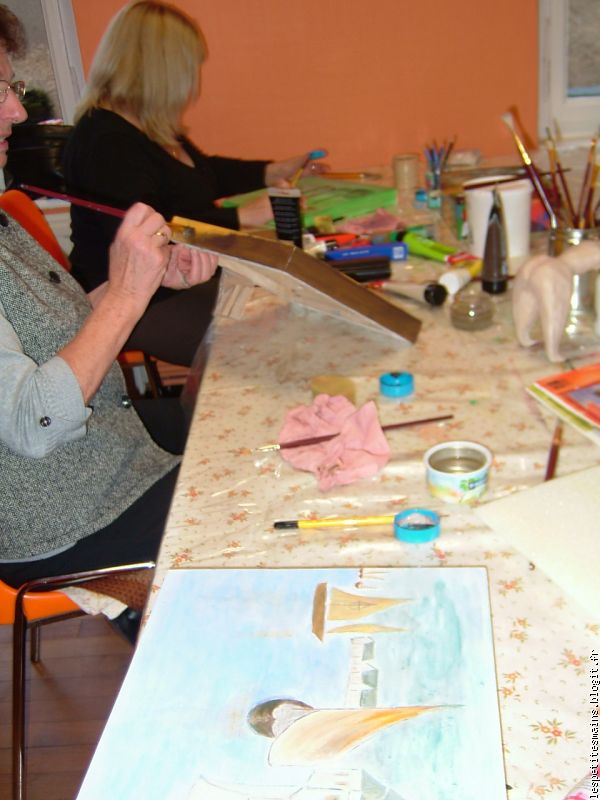 Encore un lundi "peuplé", chacun se retrouve le nez dans la peinture, soit pour une toile, soit pour peindre une poterie. Rosa saute de sa place dans la cuisine pour laver ses pinceaux .... Tous les goûts sont là, entre le concret et l'abstrait. Une superbe ambiance de "travail" et merci à Jeannine GUILLAUME pour avoir, toute l'après-midi, dispenser ses conseils, passant de l'un à l'autre (tu dois avoir mal aux pieds le soir).