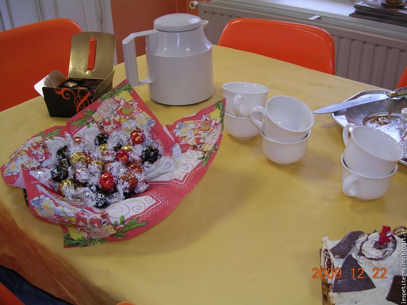 Maryse nous a ramené une superbe bûche, succulente, et Nicole a fait pété le bouchon pour son anniversaire. Entre les chocolats de Nicole, Maryse, les autres gâteaux de Noël, inutile de dire qu'après çà ne travailler plus trop ....