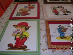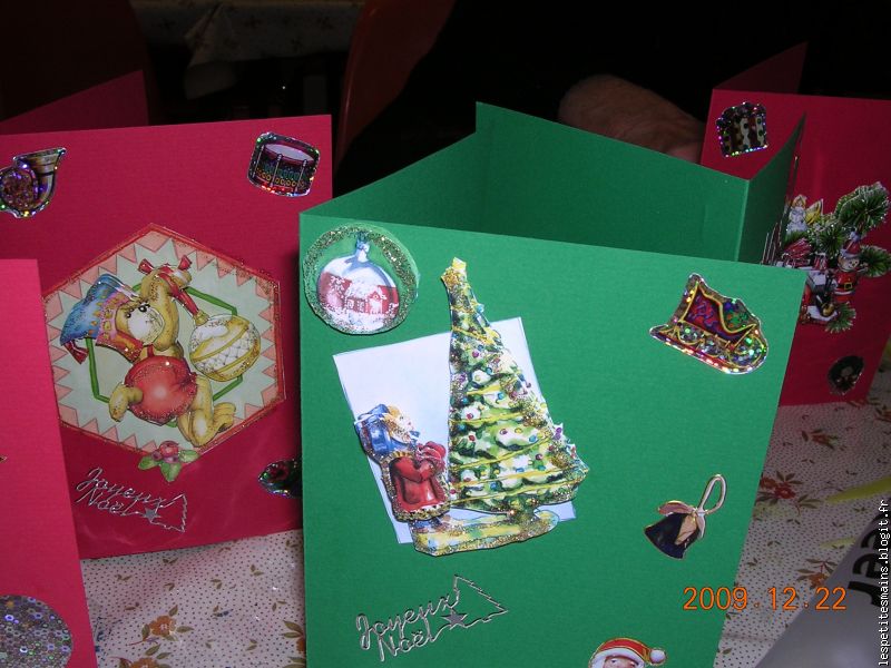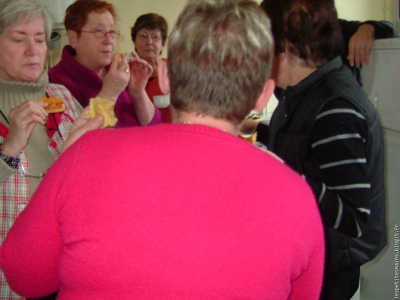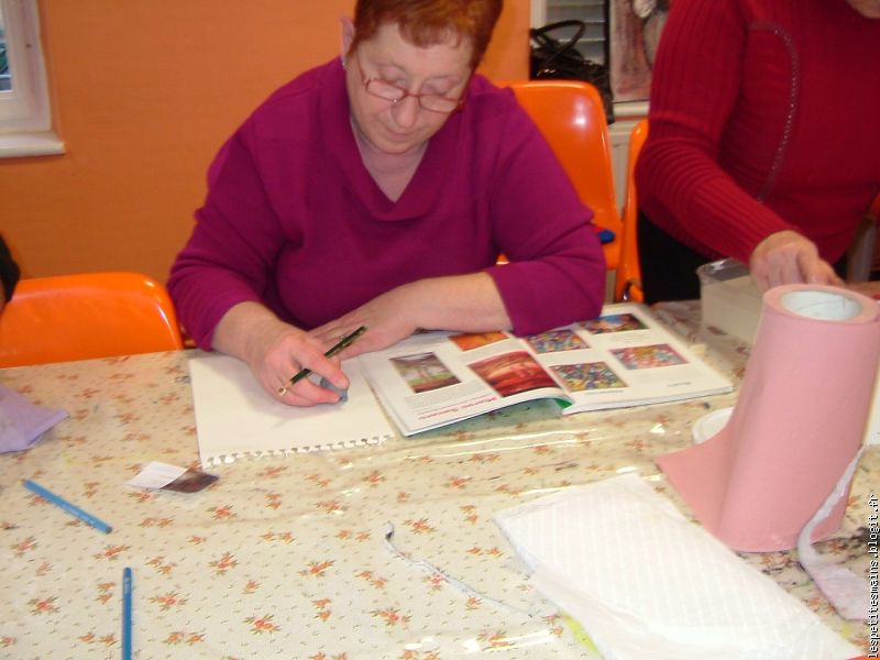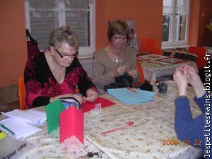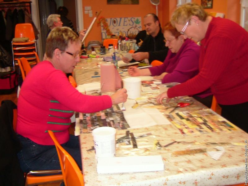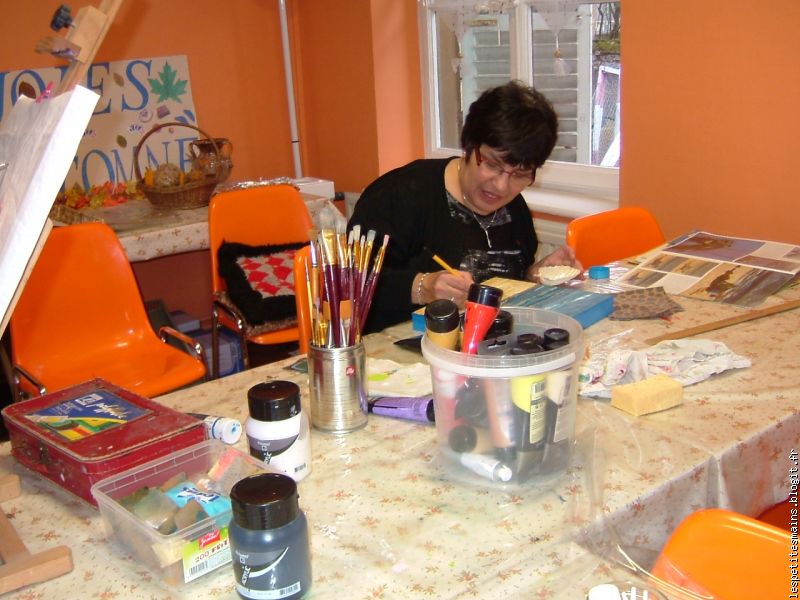 La salle grouillait de petites mains. Maryse voulait terminer ses belles cartes pour les fêtes, sa table va être belle. Marguerite, Louis, se sont lancés dans la réalisation d'une autre toile et Agnès a vernis la sienne. Monique, petite abeille minutieuse, a découpé une image, Renée, la bijoutière, a confectionné un beau collier.