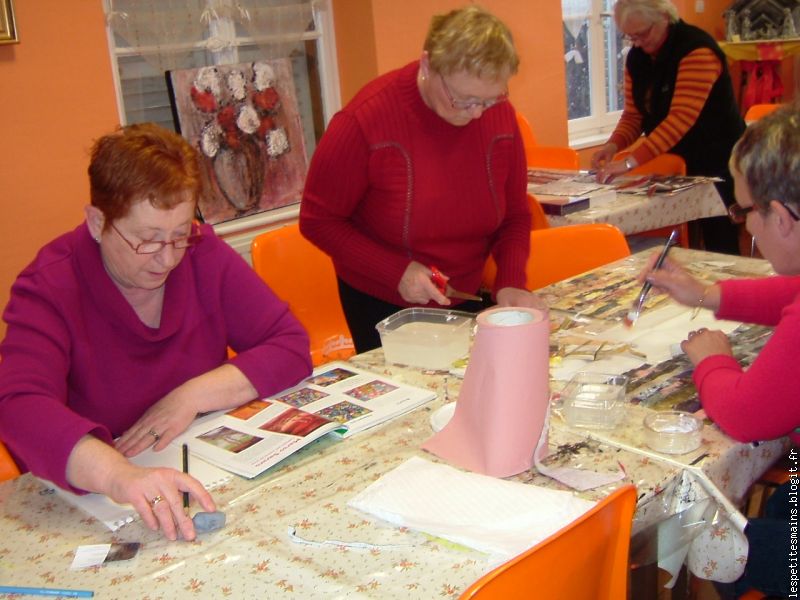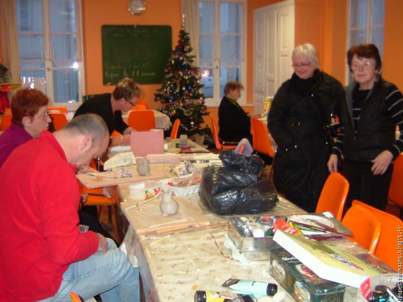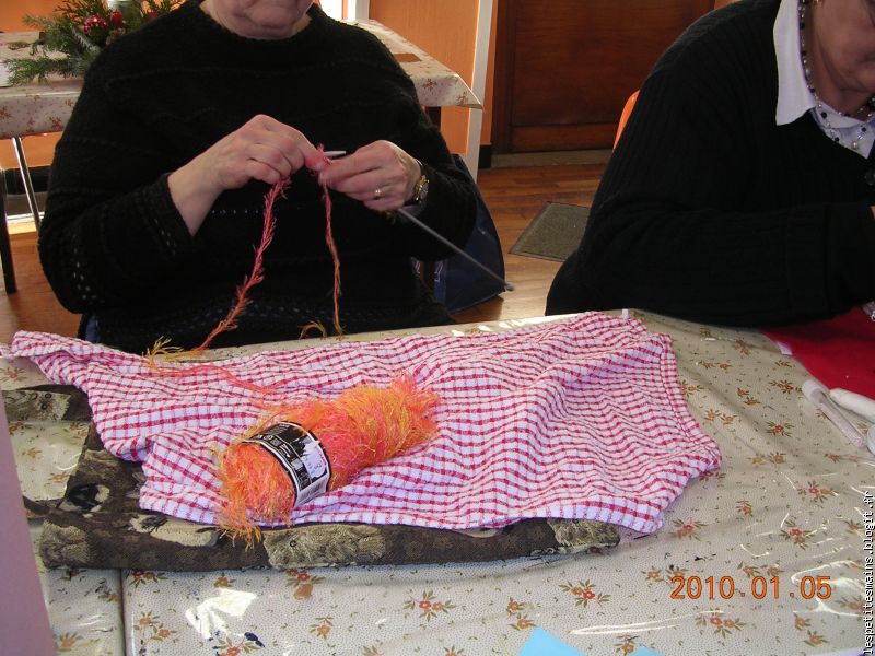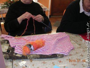 Entre Agnès, Nicole et Evelyne qui se sont lancées dans les aiguilles ... à tricoter, Lucie qui a fini son assiette, Maryse qui en a démarré deux ..., Marguerite qui a terminé son tableau (un petit bijou), Nicole et René, toujours dans les perles, Monique dans la confection d'une belle carte .... tout ce petit monde a papoté, rigolé, une ambiance d'après fêtes bien agréable.