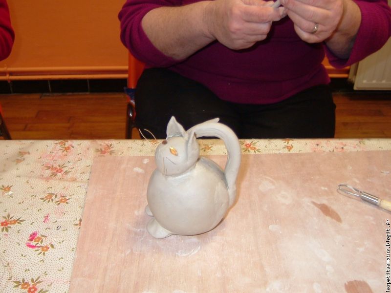 Après-midi studieuse, çà y est, le boulot a repris !! Notre nouvelle "petite main" a pu triturer la terre et a réalisé sa première création, un petit chat tout rond. Il ne reste plus qu'à sécher avant de le mettre en peinture. Jean-Michel, lui aussi, a fait sa première poterie et ... comme tout le monde, a commencé par un petit chat ... le copain de celui d'Annie.