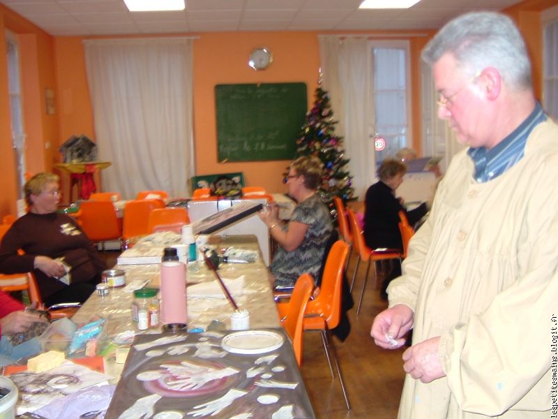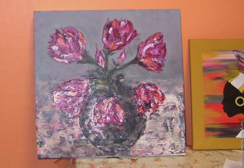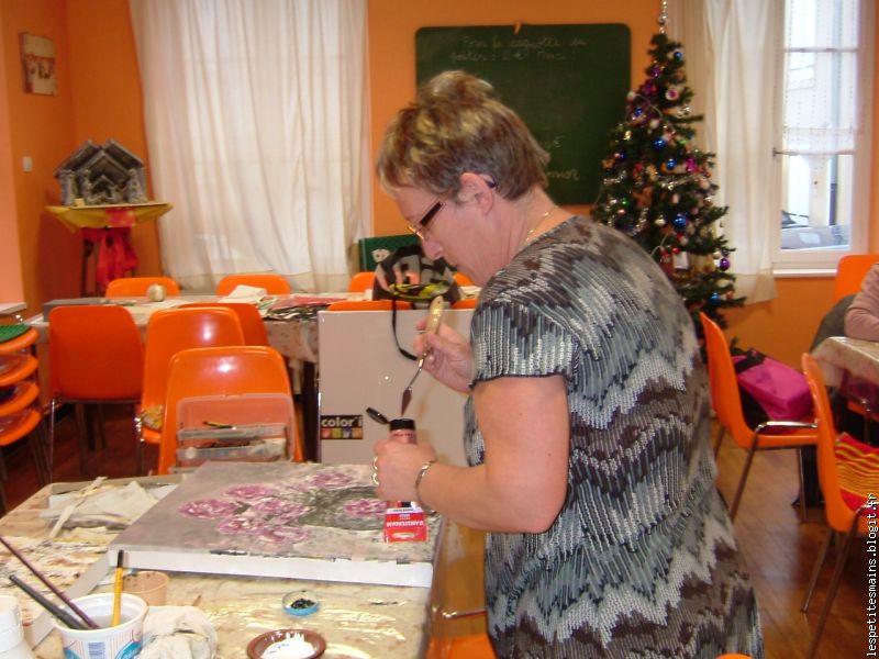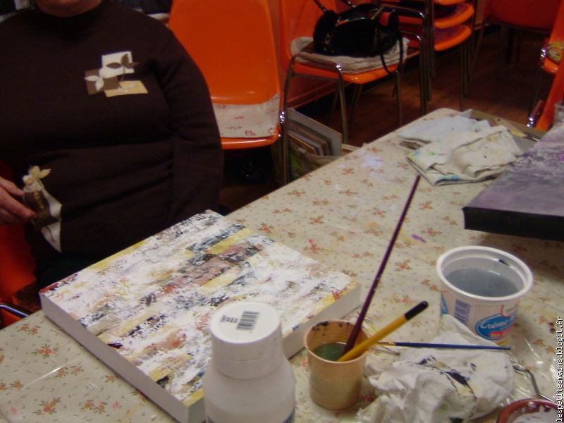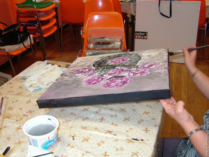 Jacqueline marouffle sa toile tandis que Brigitte met la dernière main à la sienne. Agnès se bat avec ses couteaux !! mais il faut voir le résultat ... super. Danielle a terminé sa toile, une petite merveille de finesse. Michèle se relance dans une nouvelle peinture.