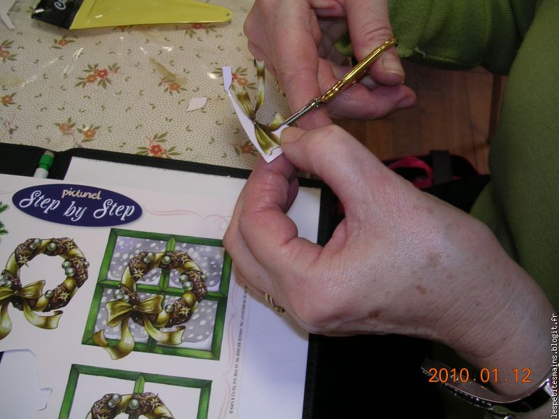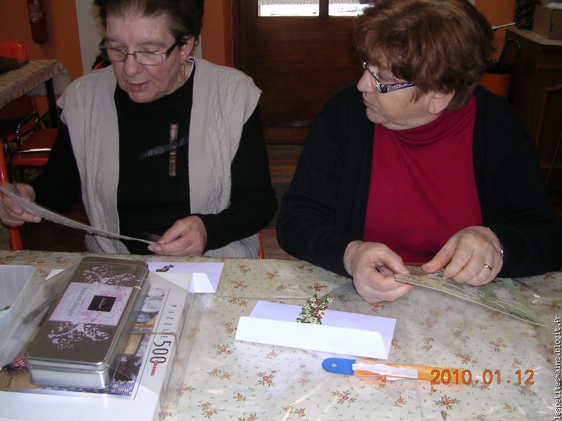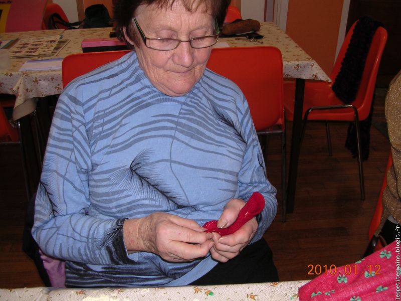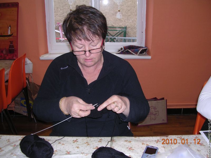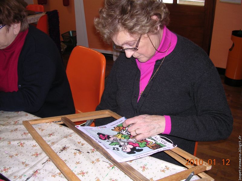 Pendant ce temps, imperturbables, les tricoteuses s'exitent sur leurs aiguilles et le travail se fait petit à petit. Marie-France, toujours aussi sérieuse et studieuse, a presque terminé son canevas, c'est vraiment un travail de longue haleine.