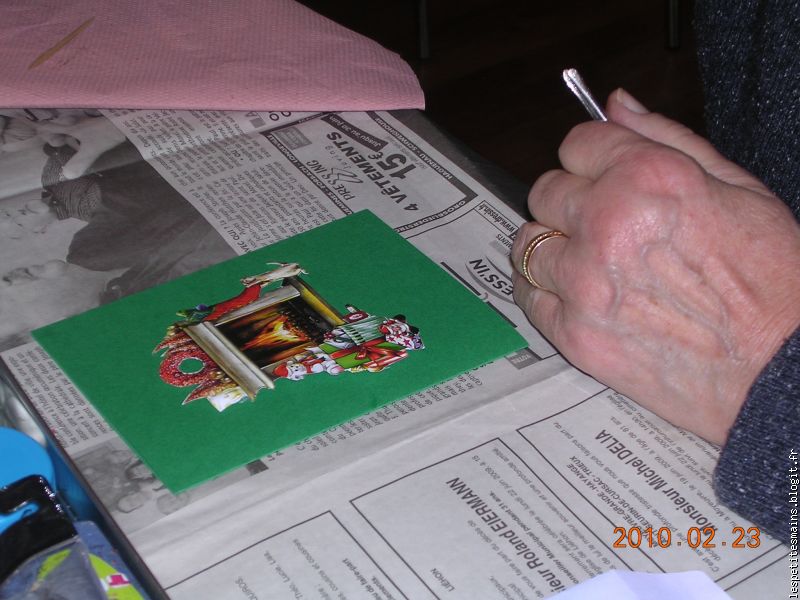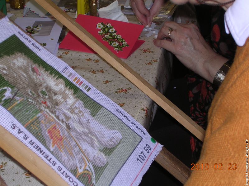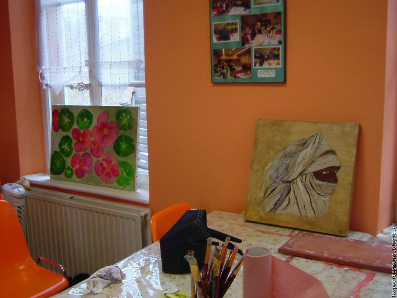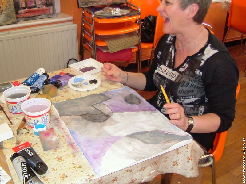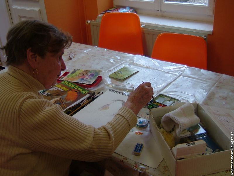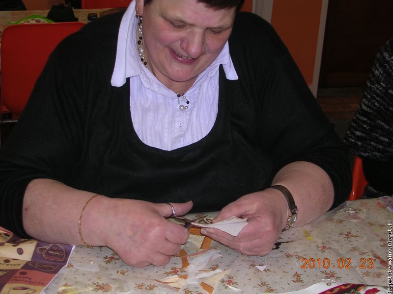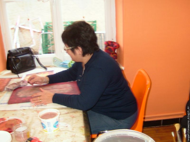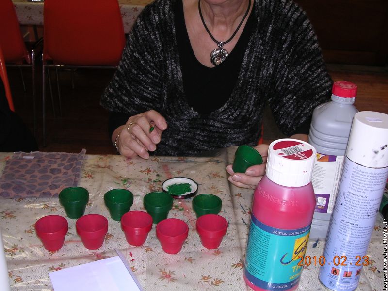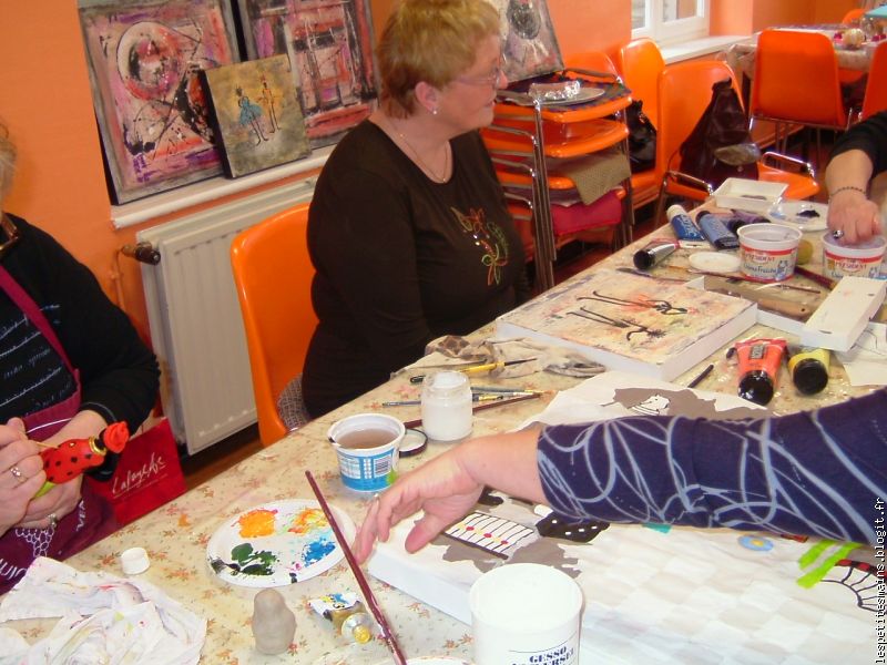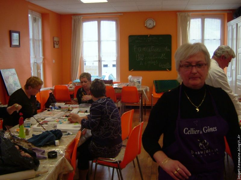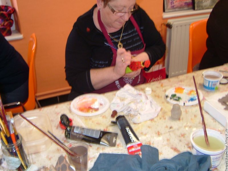 On découpe, on colle, on peint, on brode, il y en a pour tous les goûts ... et tout cela avec des fous rires, des vas et viens. Evelyne fait des allers-retours entre le club et l'extérieur pour vernir les petits pots...