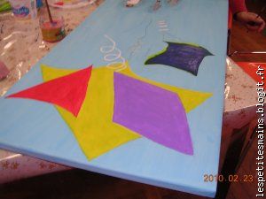 Agnès est dans ses cerfs-volents : et je cherche et je cherche les bonnes couleurs, tout celà sous l'oeil de Marguerite.