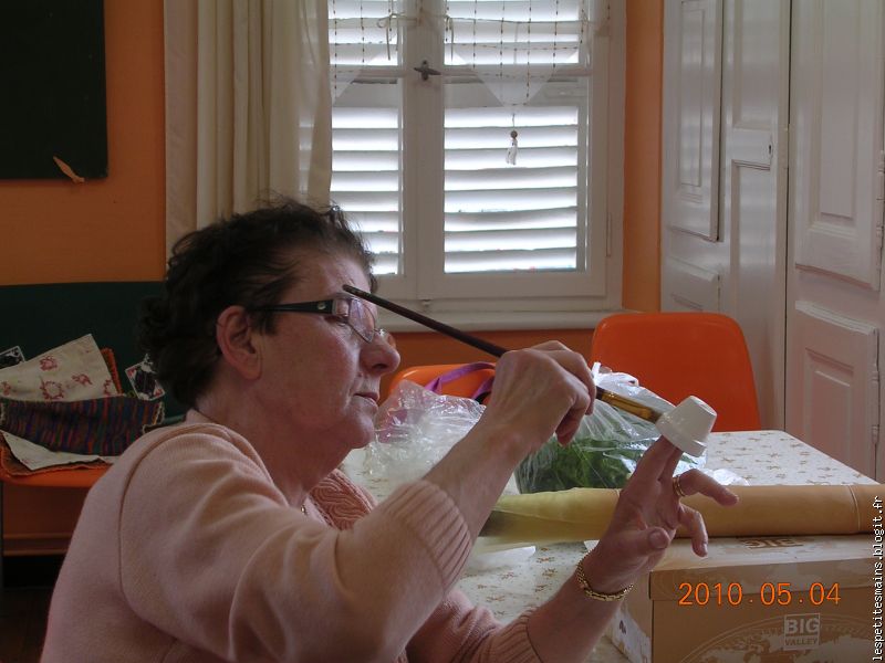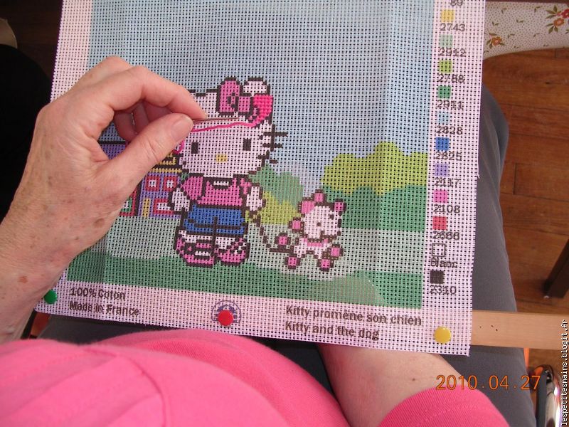 Marie-France pique, pique dans son nouveau canevas. Encore un ouvrage de patience !
