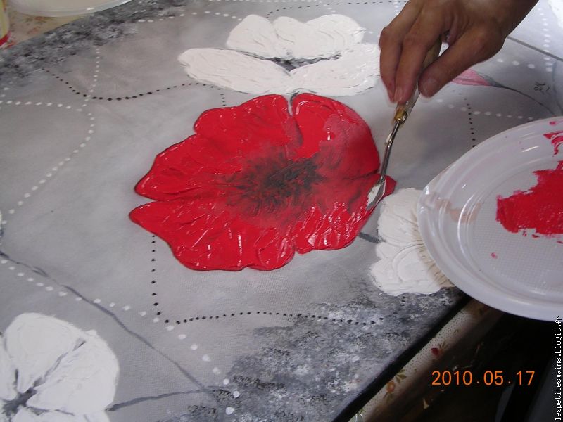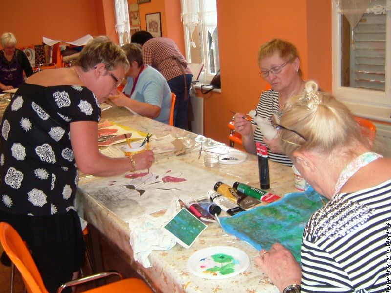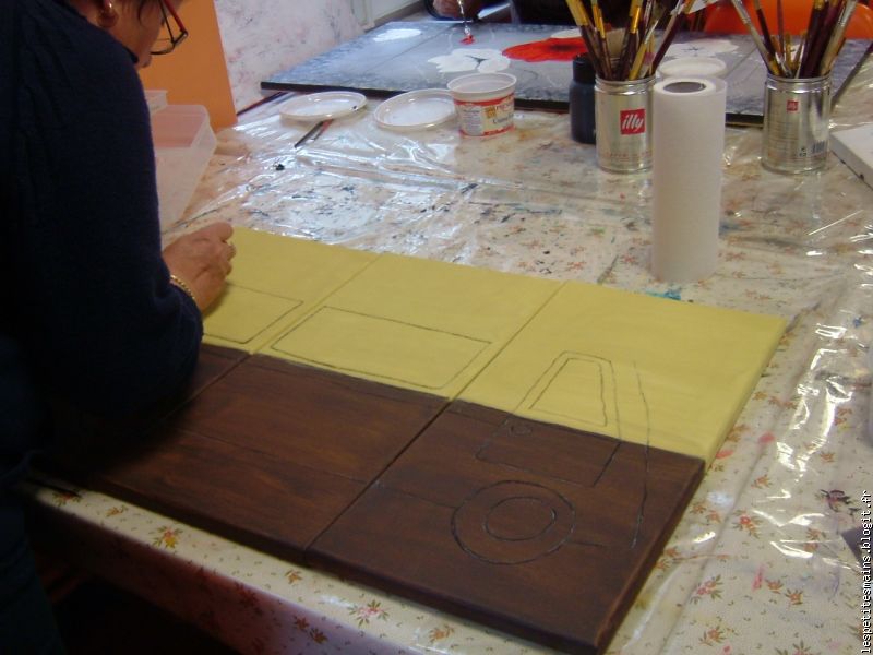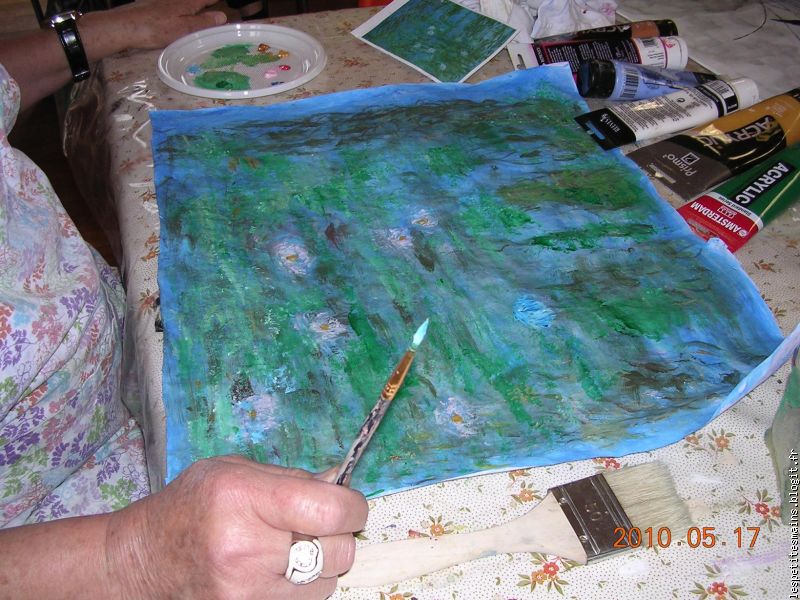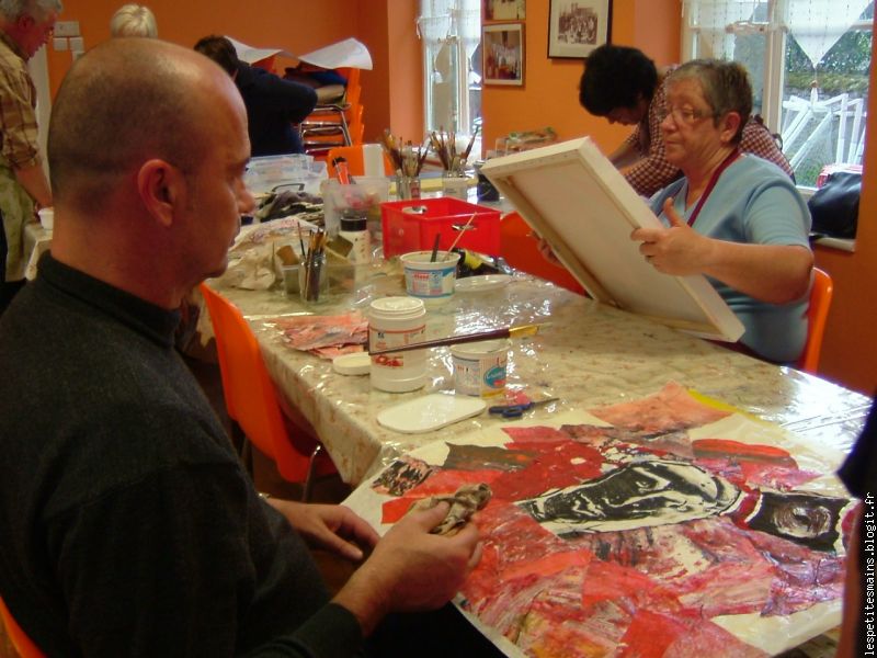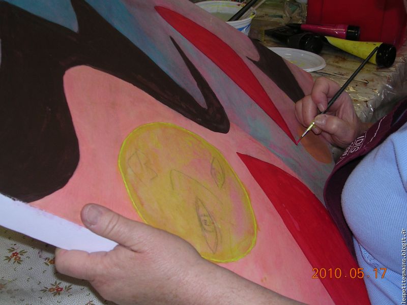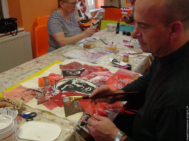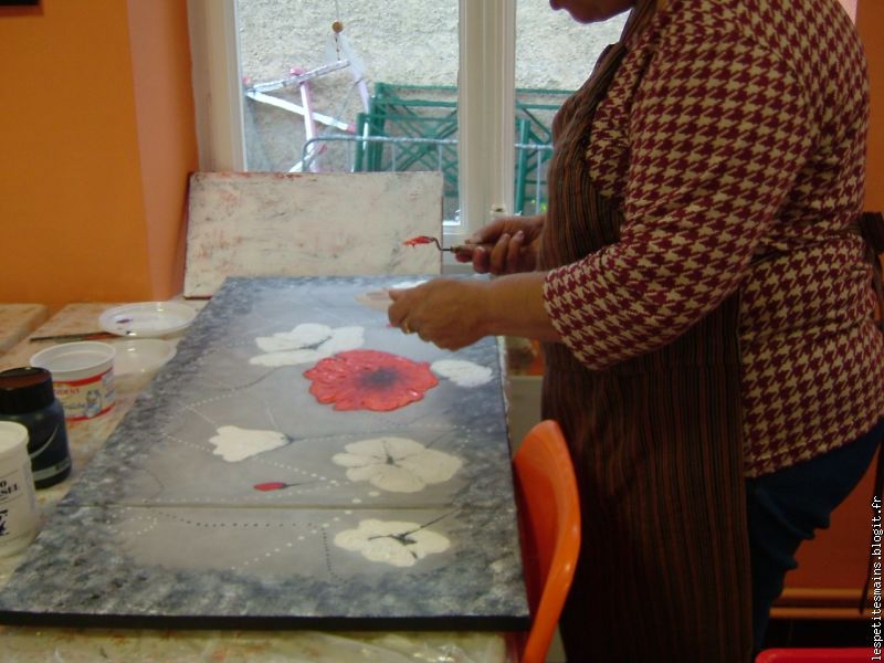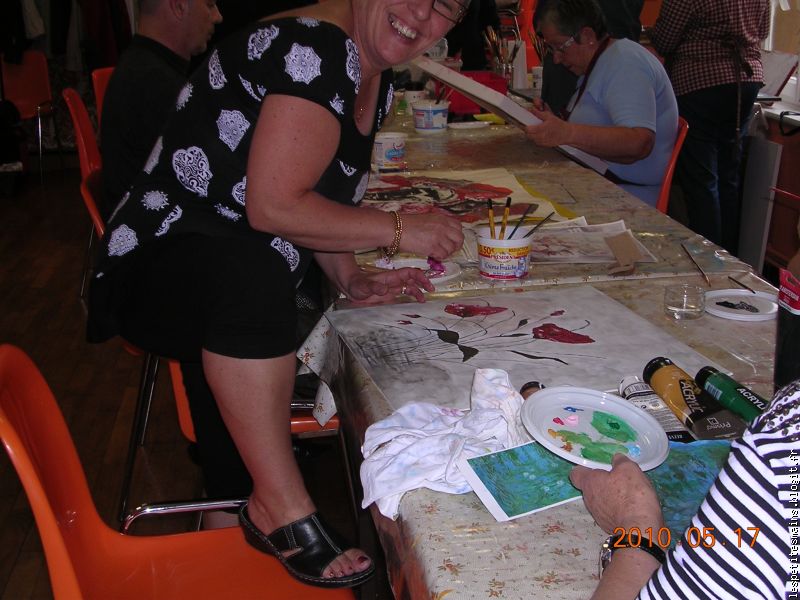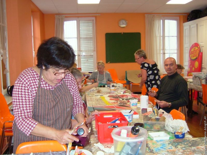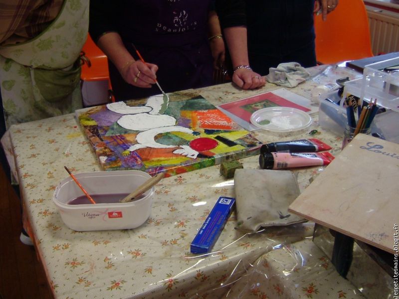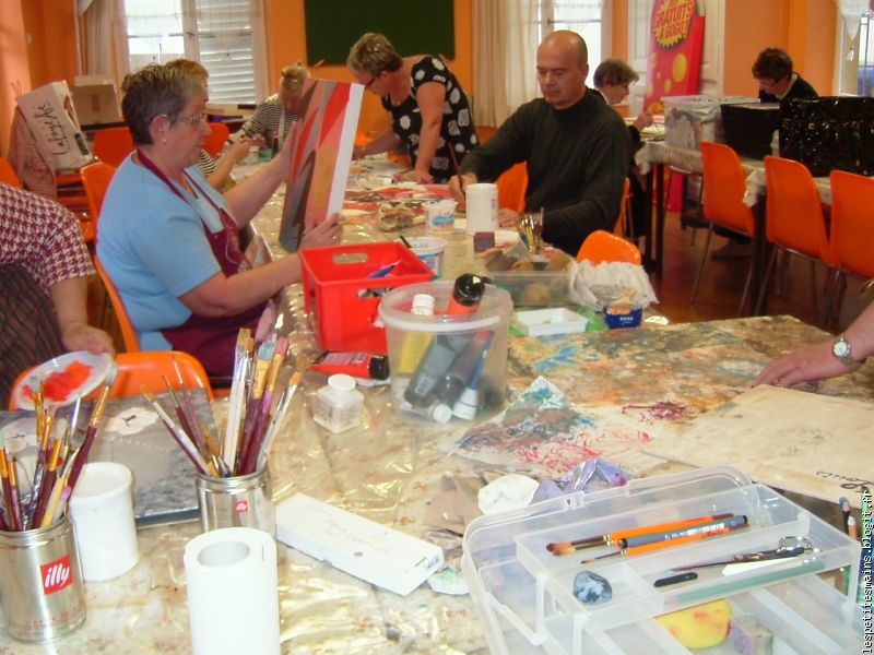 Fous rires à n'en plus finir ... encore une séance euphorique ! pourtant ce n'est pas la pleine lune, peut-être la météo qui nous motive pour amener des rayons de soleil. Quoiqu'il en soit, chacun avait envie d'y aller de sa petite anecdote .... mais tout de même, nous avons bien travaillé, entre les nouvelles toiles, celles qui se terminent, Jacqueline qui peint sa belle poterie.