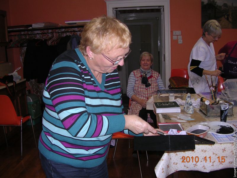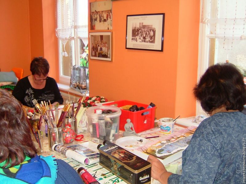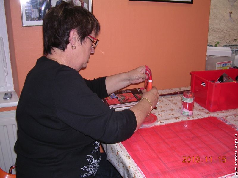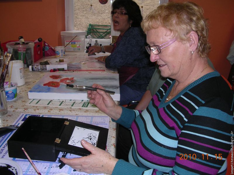 Monique M., encore un travail miniteux, avec le pinceau, le vernis ... toujours prête à mettre sa minutie au service des petites mains.