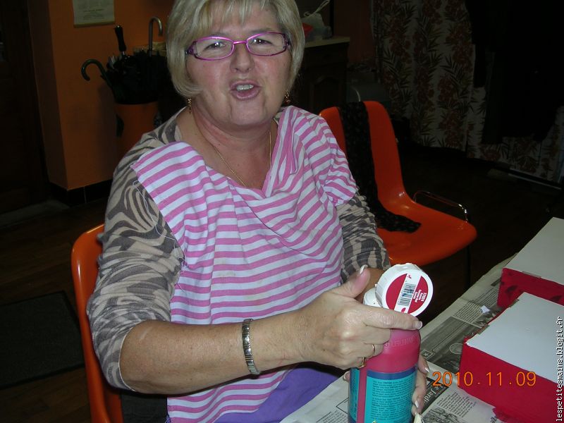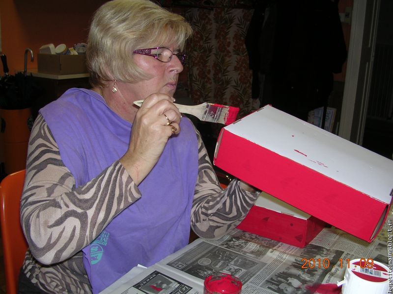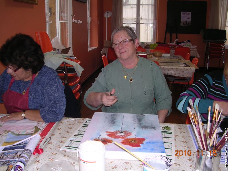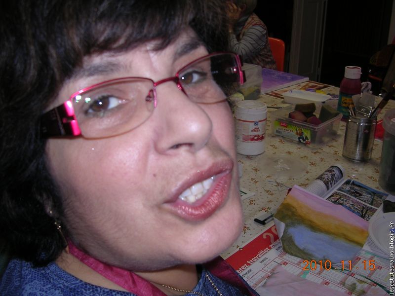 Maryse, sacrée Maryse, elle qui n'aime pas peindre, elle s'est retrouvée avec un pinceau et vas-y ... sur le pantalon (celui qu'elle préfère, le beau, le chaud !) ... et ses beaux ongles ... tout rouges. Je pense qu'elle se tiendra loin d'un pinceau pendant longtemps .... D'ailleurs, comme elle dit toujours, "je ne viendrai plus" !!! (impossible sans toi les mardis).