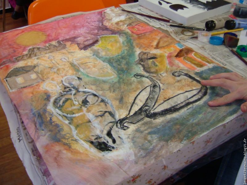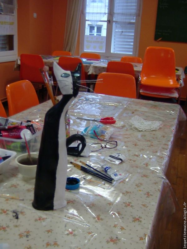 Aujourd'hui beaucoup de participants ont terminé leur réalisation : Alexandra est partie chargée de ses chats, petite fille, Chantal a emballé son beau chat deux couleurs dans un écrin de papier journal, juste la tête qui dépasse du sac, plus vrai que vrai !