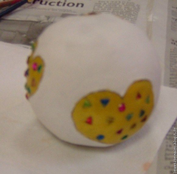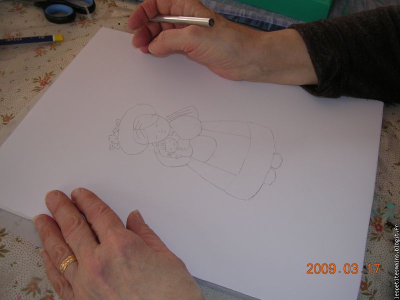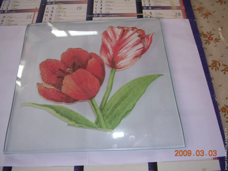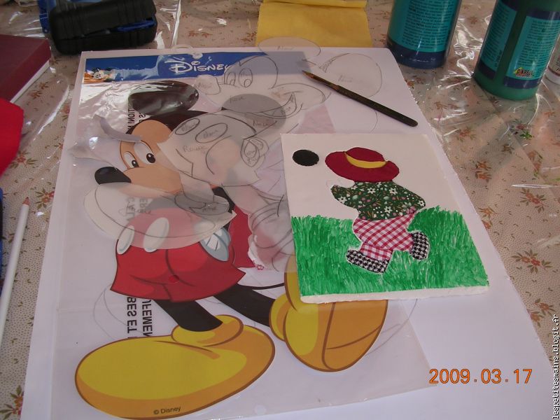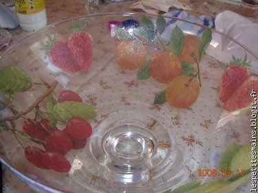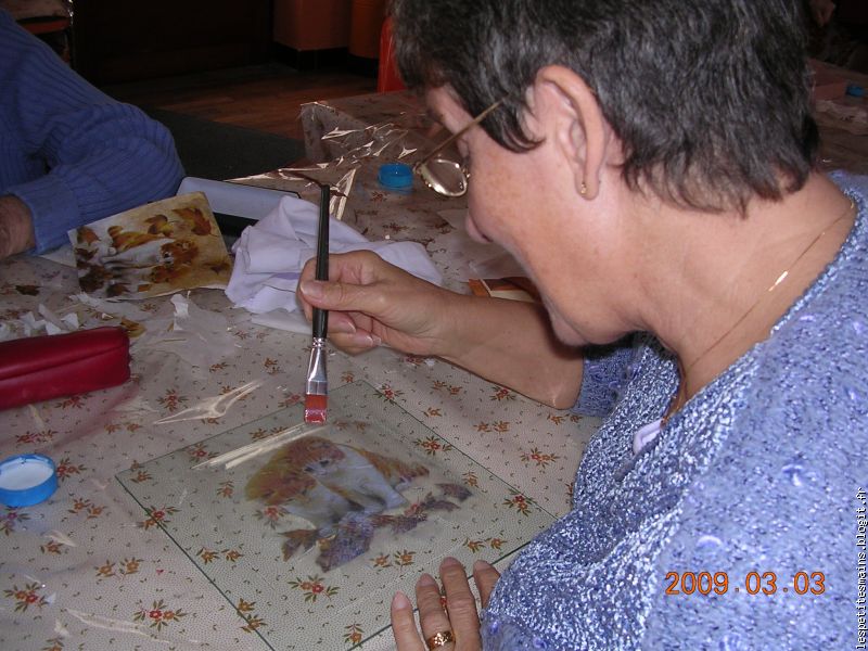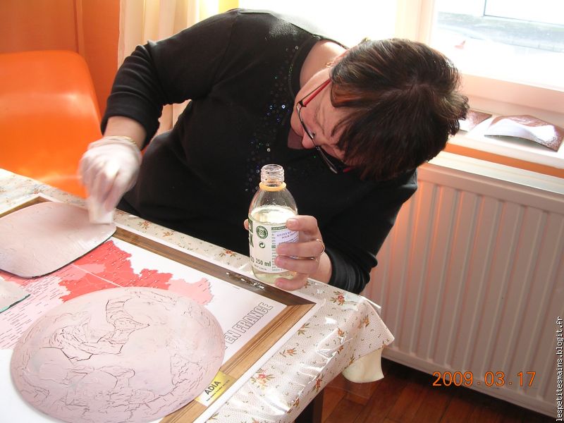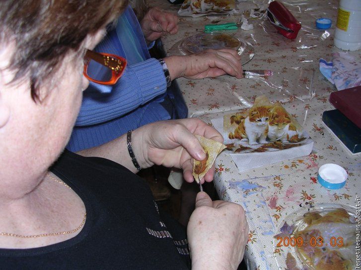 Mardi, après-midi folle, il faut croire que les premiers rayons de soleil y sont pour quelque chose ! Nicole part dans un fou rire qui a contaminé toute la salle !! mais nous avons tout de même réalisé de belles choses, entre les assiettes à finir, celles à vernir, les serviettes à découper. Maryse a entrepris de décorer une énorme coupe sur pied, avec des serviettes de fruits, pour sa fille. Il faut voir comment elle s'applique ! Nous avons également démarré la réalisation de tableaux avec des personnages découpés dans du tissu, adorables.
