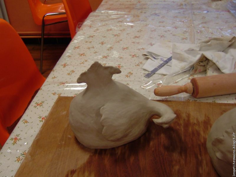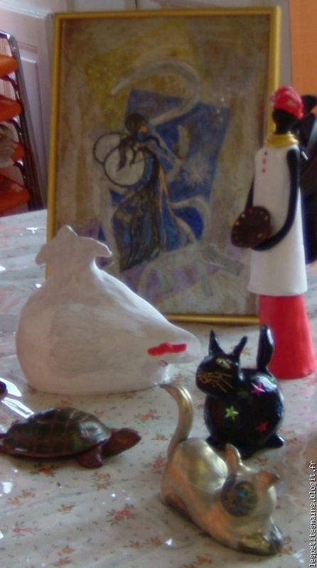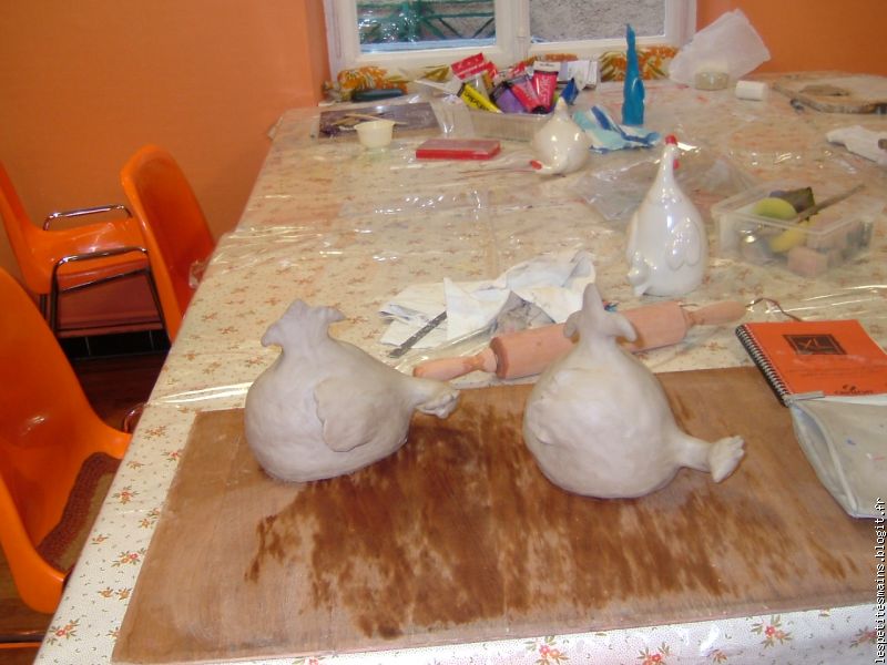 Lundi, quelle fierté de mettre en peinture nos réalisations de poterie. C'est ainsi que les poules sont de toute beauté ! Sylvia a réalisé trois magnifiques tableaux pour sa cuisine, Brigitte a entrepris la peinture de nénuphars, Louis a commencé la peinture de deux gamins jouant au football, etc .....