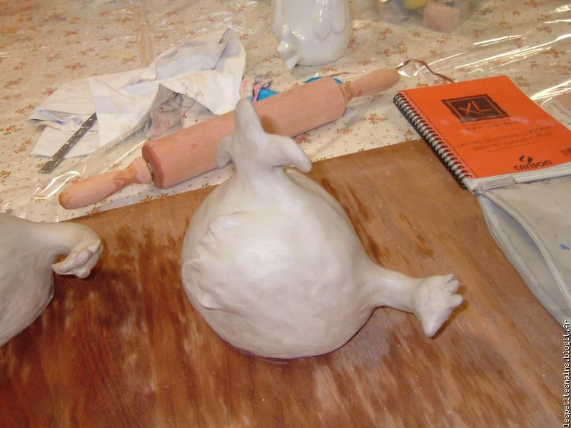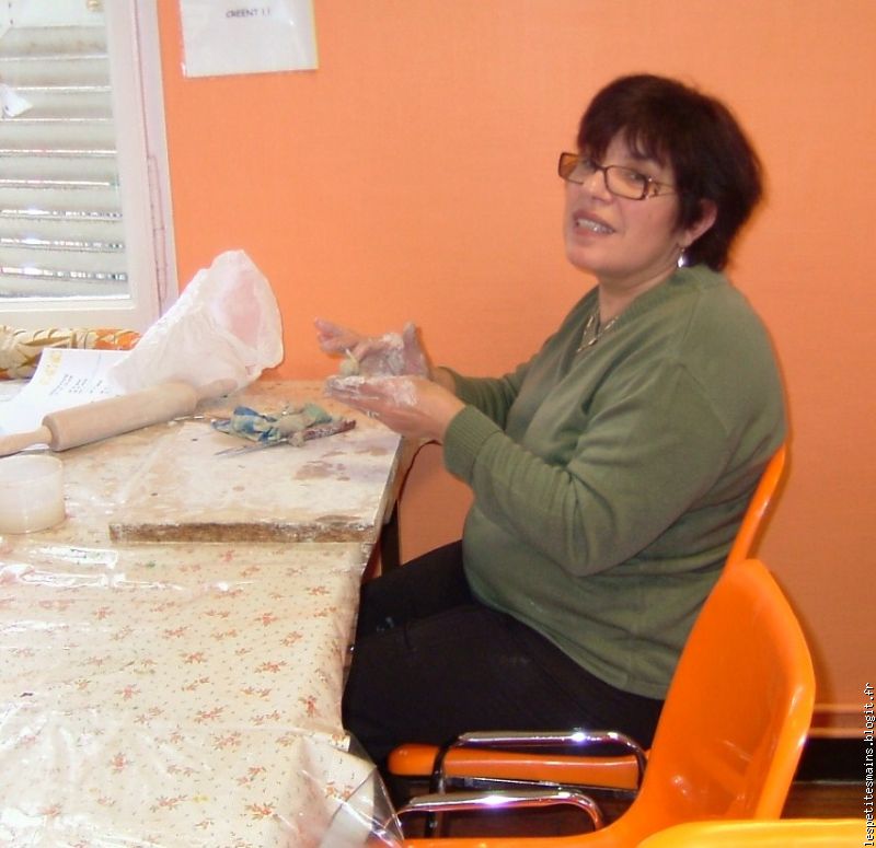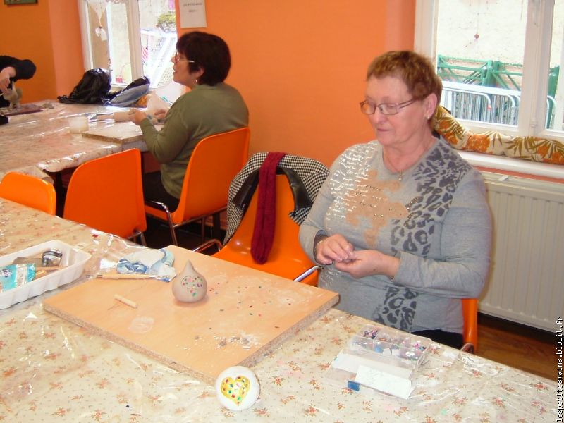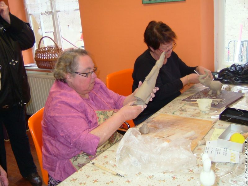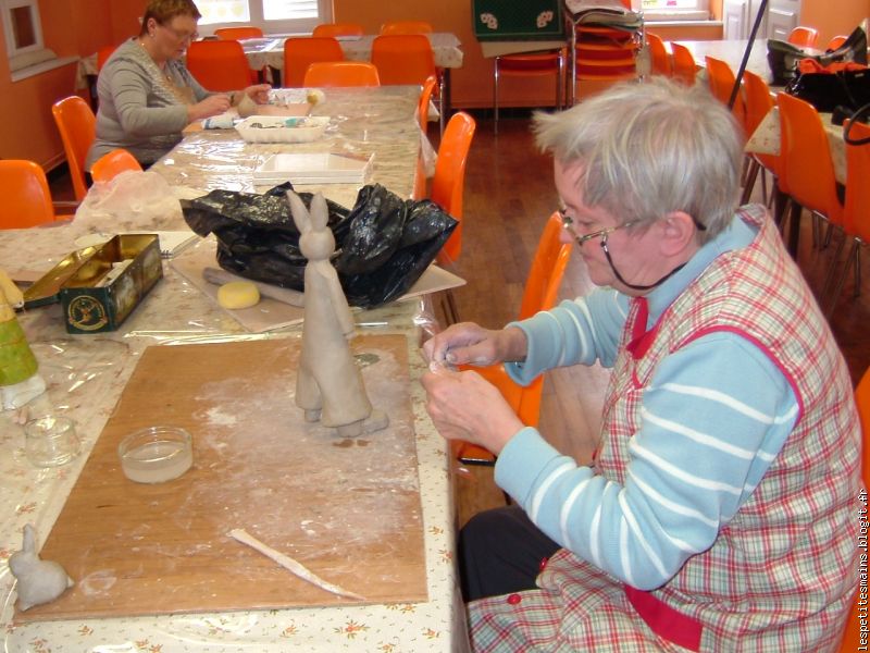 Encore un après-midi bien rempli ! Tous étaient super-concentrés sur leur terre. Jeannine ayant ramené un lapin (de Pâques !!), plusieurs personnes se sont lancées dans la réalisation de cet objet et il faut dire qu'ils sont mignons, mignons. Marguerite a réalisé un chat (une commande, hé oui, victime de son savoir-faire !), Chantal a fait une africaine, il faut voir comment elle s'applique. Jacqueline a fait une "goutte" pour accompagner sa boule pour le futur panier qu'elle veut présenter. Agnès a refait un éléphant, de plus en plus beau. Louis s'est lancé dans la fabrication de bijoux pendentifs. Noëlle, pas très inspirée, a tenté une tortue, qui ne lui a pas plu, et donc a fini par l'aplatir. Elle sera plus belle la prochaine fois !