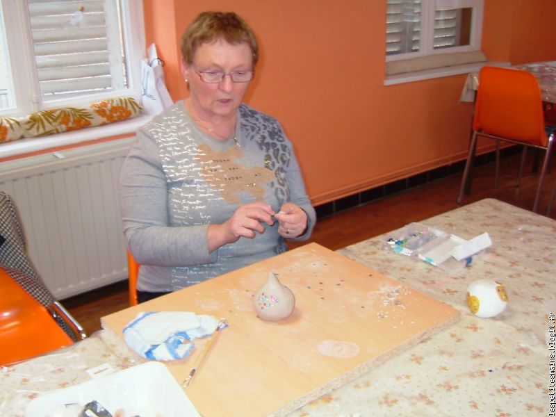 Entre fous rires et moment d'intense concentration, l'après-midi s'est déroulée dans une superbe ambiance. Toutes les réalisations sont à l'état brut. Maintenant, elles doivent sécher puis nous passerons à la peinture, à la cire, au vernis .... et le résultat promet !
