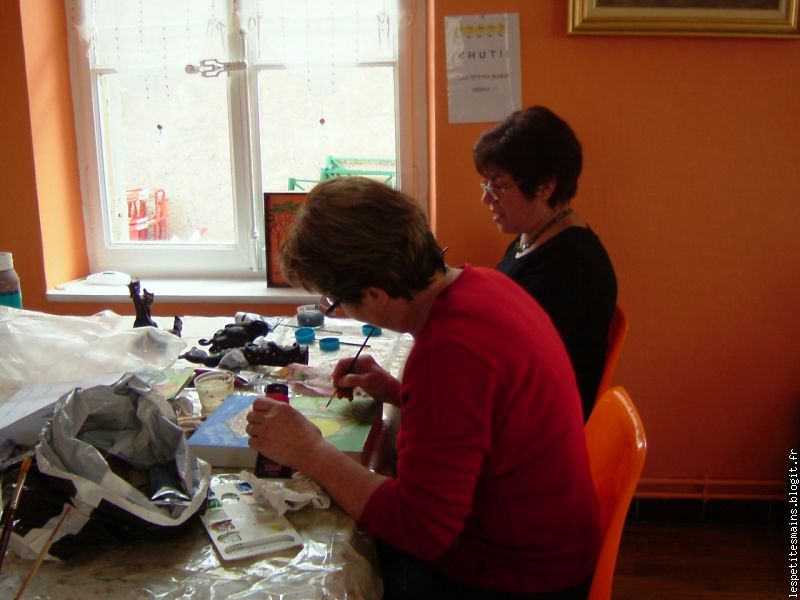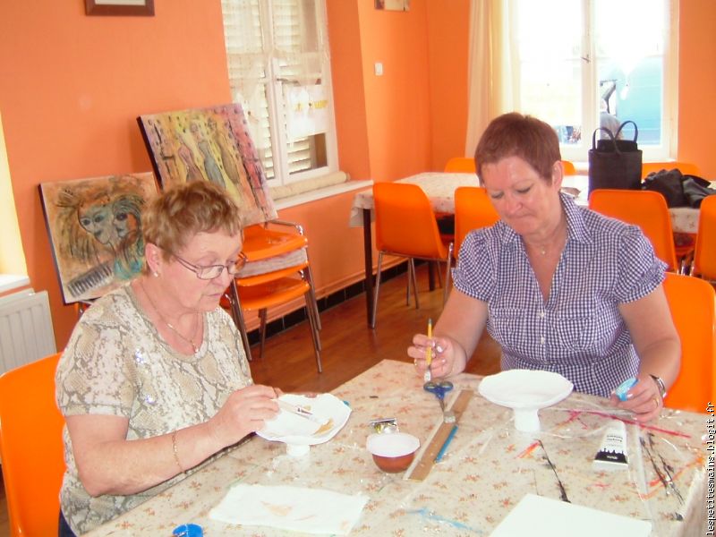Mardi, chacune a ramené de quoi s'occuper : tricot, broderie. Nicole a terminé son tableau en tissu (magnifique) et il fallait voir comment elle s'appliquait. Léda a également fini son assiette, elle est très satisfaite.