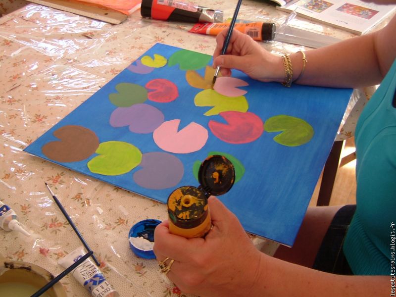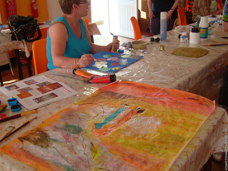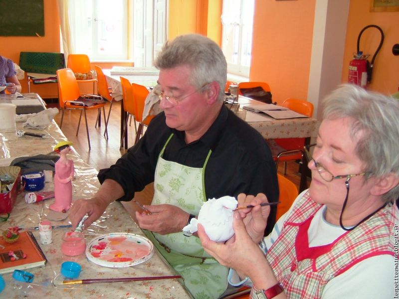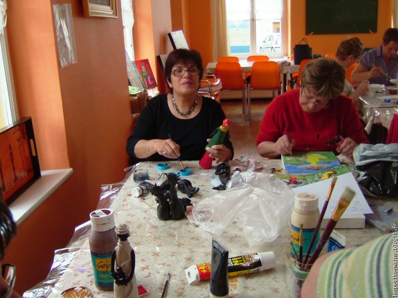 Et voilà encore deux jours d'activités terminés et une nouvelle fois, tous étaient très concentrés. Lundi, les petites mains ont peint toutes les réalisations de poterie, et il y en avait. Entre rires (merci Sabine) et sérieux, les : poule, coupes, petite fille, pommes, poires, etc .... se sont transformées. Michèle a terminé son tableau, Agnès a démarré sa toile.