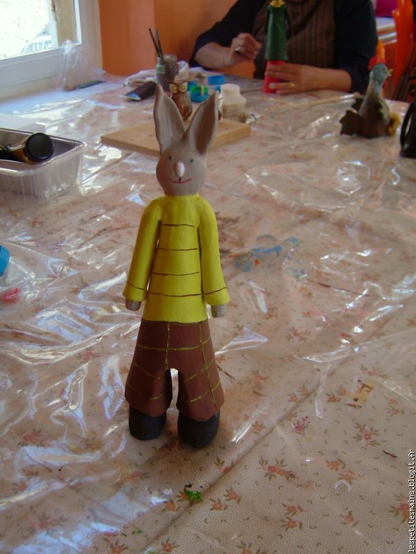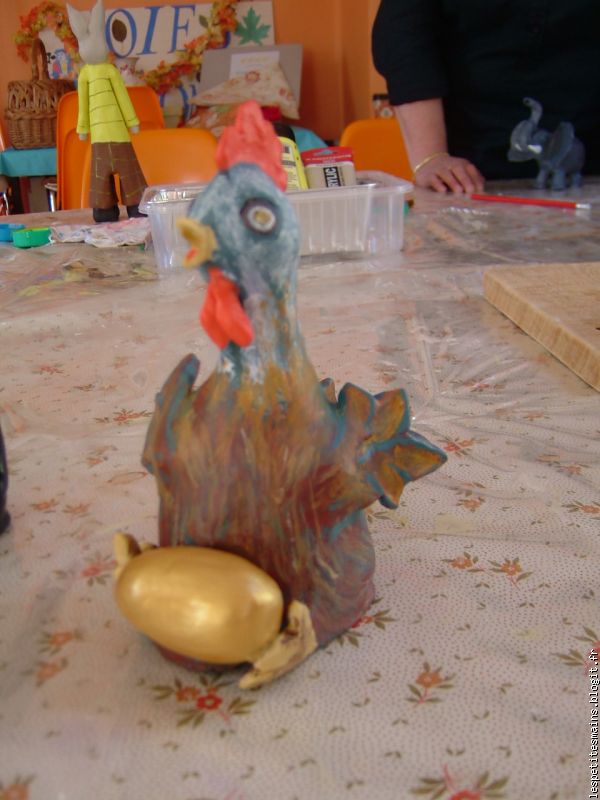 Danièle a fabriqué une autre poule, une poulette, avec un bel oeuf. Cà y est, elle a la main !